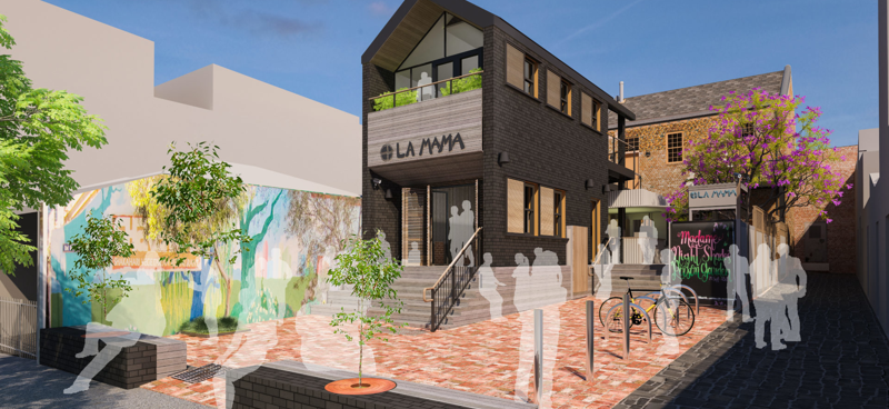 The design desires to speak to La Mama’s philosophical stance of being open, open to all. The raising of the courtyard shifts the need for transition in height, to get into the theatre door, to the entrance of the courtyard, allowing people to make that transition in their own time and without pressure.