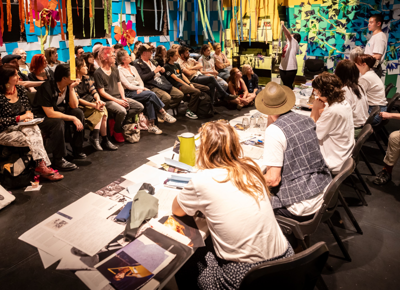 • 12 Artists (3 groups of 4) each share up to 10 minutes of work-in-progress, followed by feedback and discussion. Artists work in small cohorts over 3 weeks, in a guided process including supported preparation, work-in-progress showings and a debrief.