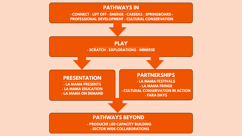 PATHWAYS BEYOND (Year-round) La Mama Producers support artists to extend their work beyond La Mama, supporting sustainable careers, self-determination, and strengthening the wider sector through advocacy and leadership.