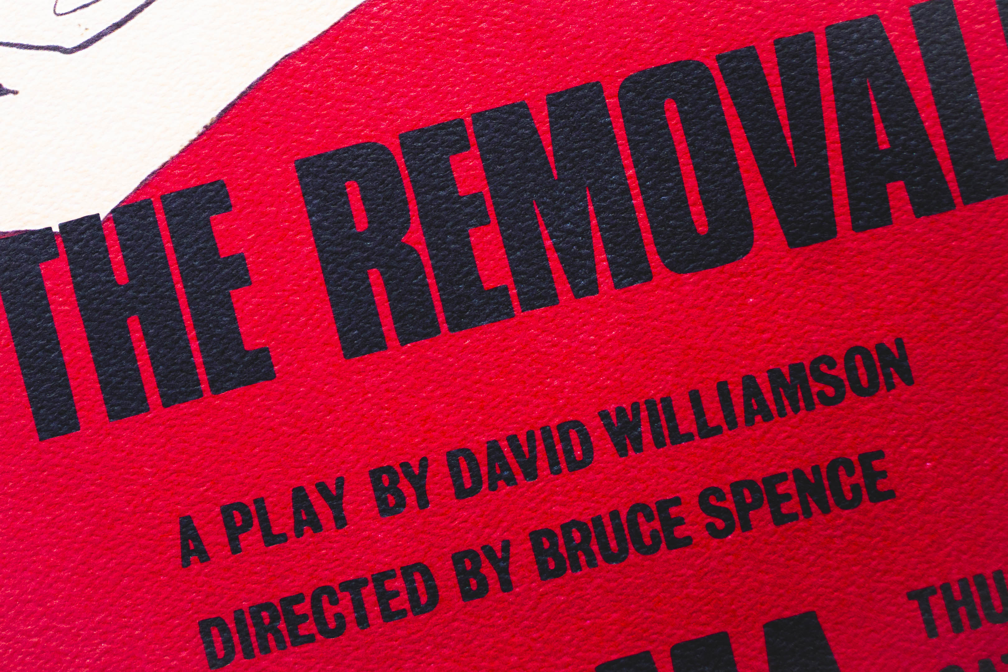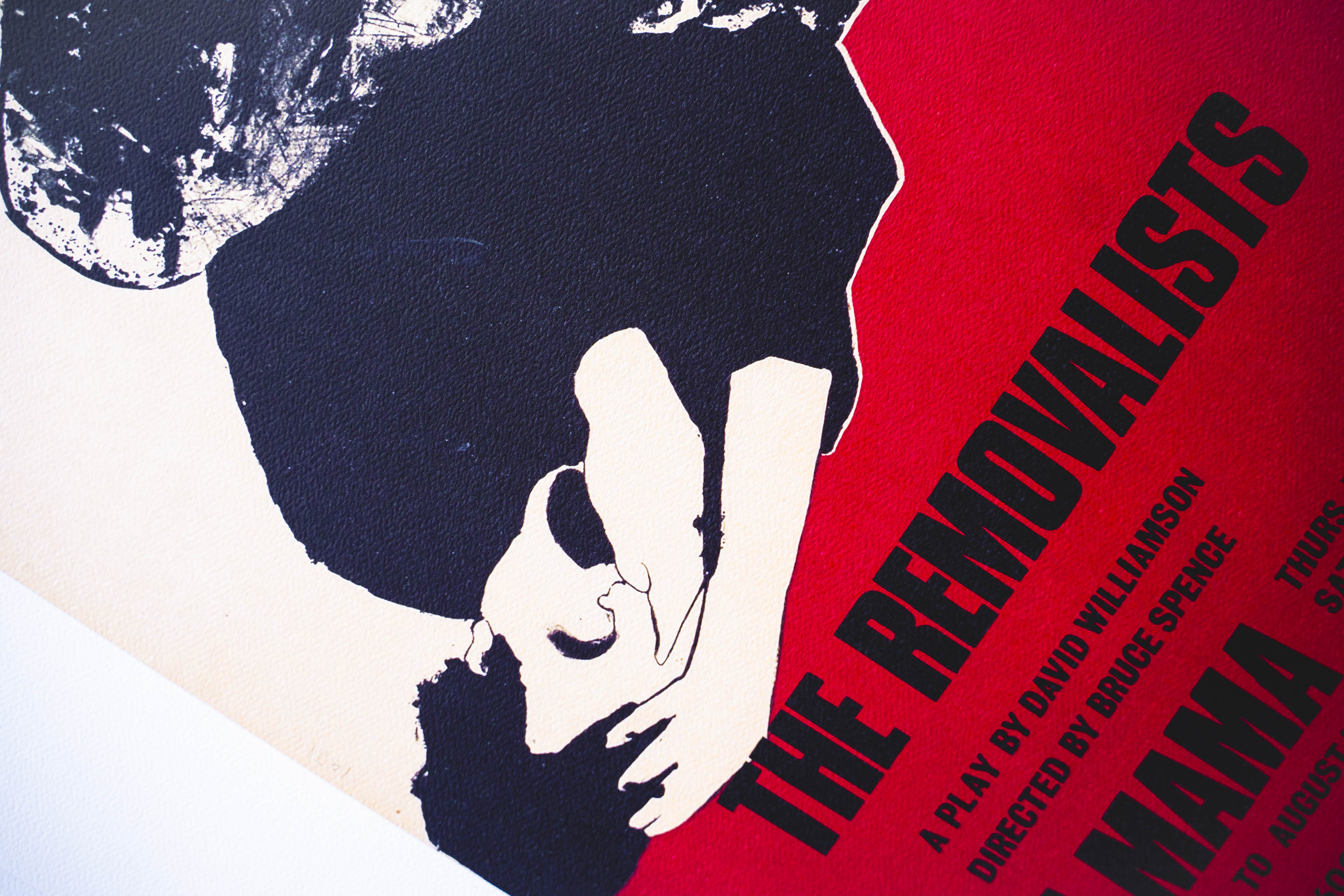 Created by printmaker Beth Parnaby (born 1946) and director/actor Bruce Spence (born 1945), The Removalists print embodies the collision of performance and visual art. Spence, whose five-decade career spans stage, film, and television (including Mad Max 2 and The Matrix Revolutions) brought his theatrical energy to the project. He made his film debut in Stork in 1971, based on, “The Coming of Stork” by David Williamson, which premiered at La Mama in 1970. Parnaby, an acclaimed printmaker with works now in the National Gallery of Australia and the National Gallery of Victoria, drew on her creativity and technical skill as a print maker. Their collaboration captured the dynamic interplay between inner-vision, text and lived experience.