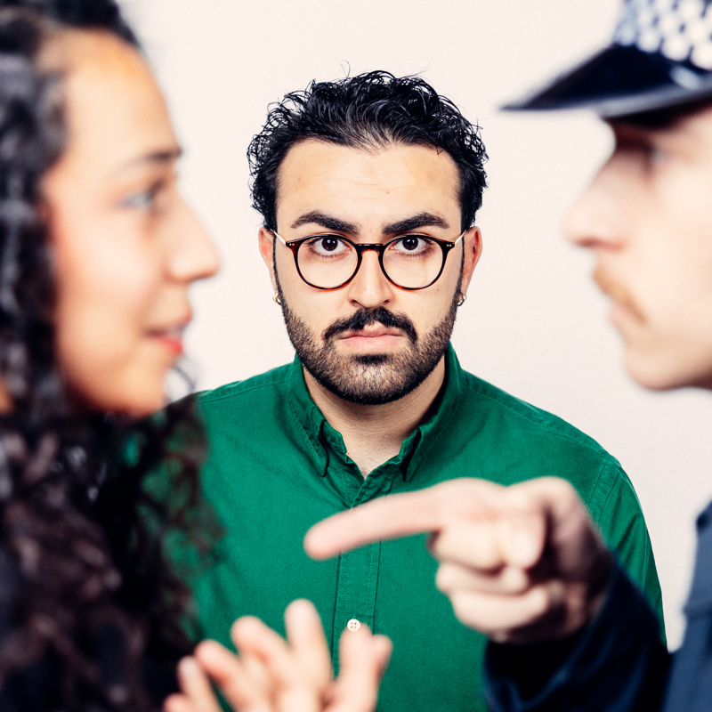 A queer Arab woman, a white male cop and an interpreter. Between question and answer, one language and another, stands the truth, confused.